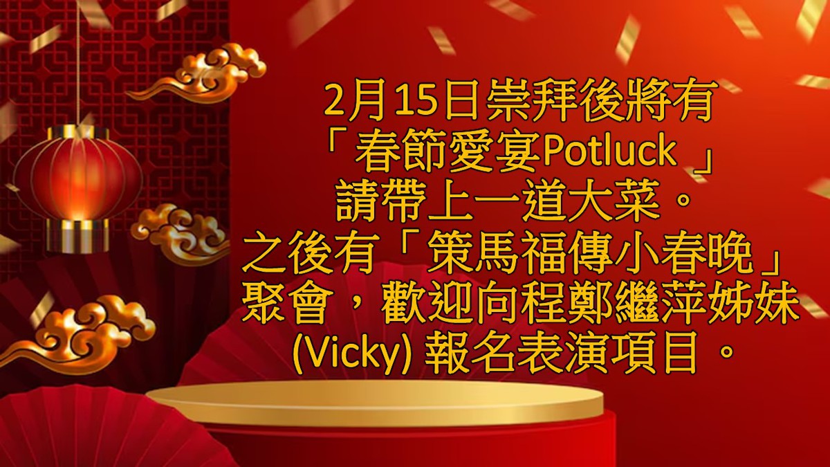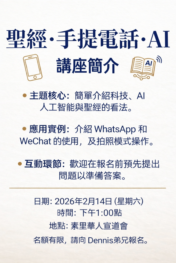 2026 年素里华人宣道会启发课程将于 3 月 28 日 至 5 月 30 日 在本教会举行,每周六晚上 6-8 時,欢迎弟兄姊妹代祷并踊跃参与。